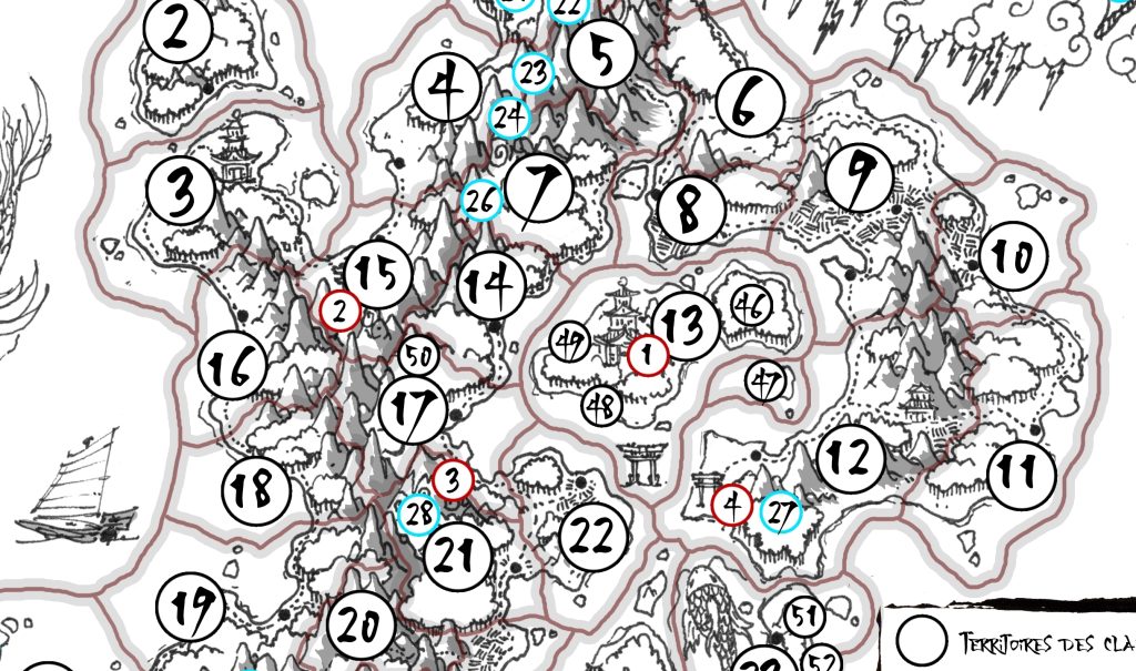 Les territoires de clans Samouraï utilisent des cercles ouverts (numérotés en noir).